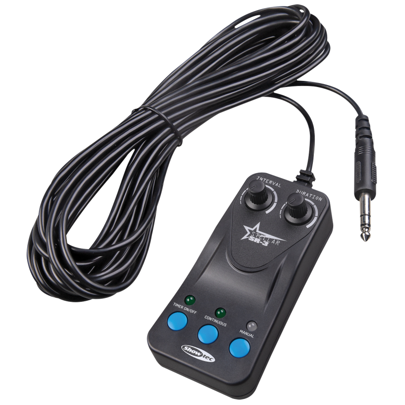 The Showtec SR-3 Timer Remote is a dedicated timer remote for controlling the output of the Showtec Stellar F-1000 Fogger, F-1500 Fogger and FZ-1000 Fazer. Interval and Duration controls allow you to set the time between activation and the duration of the activation. A timer on/off button with LED indicator can be used to activate the timer. The output volume is set on the effect machine itself. A continuous output button activates the output continuously, while a manual button activates the output when pressed. The SR-3 has a 8-metre cable.